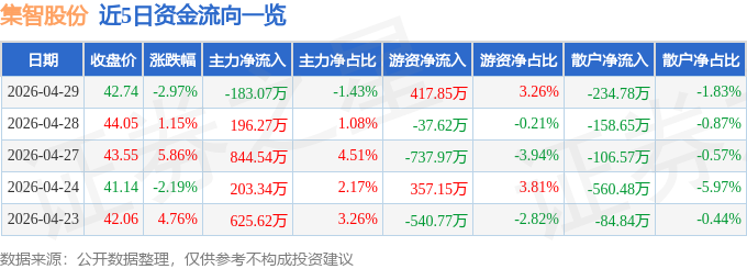 证券之星音讯,到2026年4月29日收盘,集智股份(300553)报收于42.74元,跌落2.97%,换手率3.51%,成交量2.98万手,成交额1.28亿元。